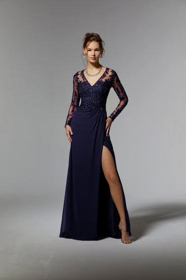 The MGNY Collection by Mori Lee 72906 Navy is a must-have for any formal event. This full-length evening gown features sophisticated tulle lace sleeves and a stunning front split for a look that will turn heads. Perfect for an unforgettable night!