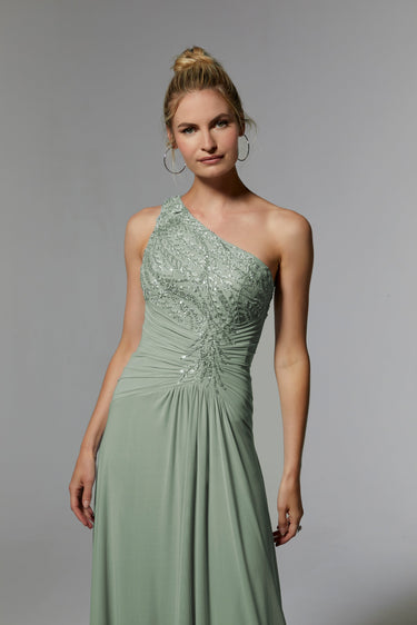 The MGNY Collection by Mori Lee 72910 features a sophisticated one shoulder silhouette adorned with intricate lace and beaded embellishments. Perfect for evening events, this classic yet modern dress is sure to make a lasting impression.