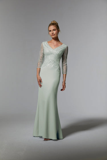 This MGNY Collection by Mori Lee 72916 Sage dress features a beaded bodice and v-neckline, combined with full length sleeves. Get ready to wow in this glamorous ensemble.