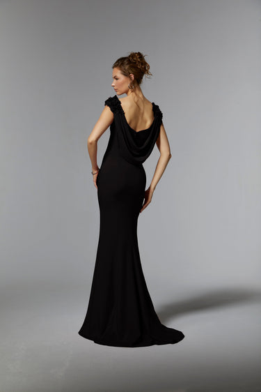 The MGNY Collection by Mori Lee 72920 Black dress features a luxurious full length silhouette and a rose detail on the shoulders with a chic cowl back. It is perfect for formal evenings and special occasions.