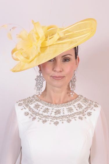 Nigel Rayment's Hatinator in Style 39 showcases a timeless design with a striking trim. The elegant brim features a feather flower and quill embellishment. Dimensions include 42cm side to side and 36cm front to back measurements.