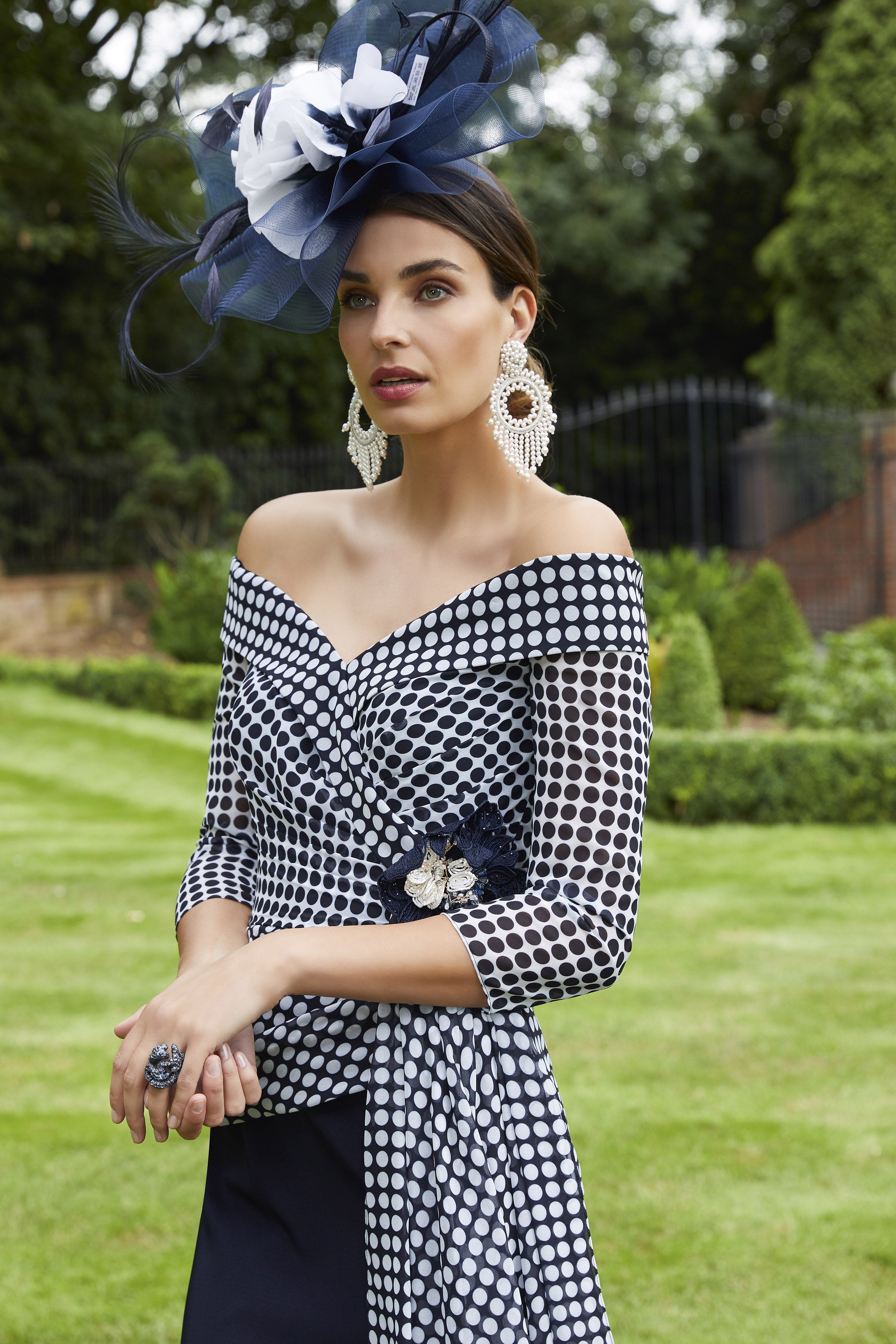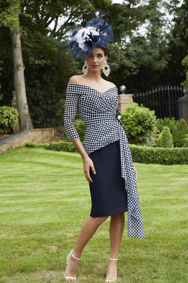 A unique dress for any Mother of the Bride or Groom. The polka dot top bodice has an off the shoulder neckline with side sash. This is complimented with the elegant solid navy skirt.