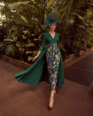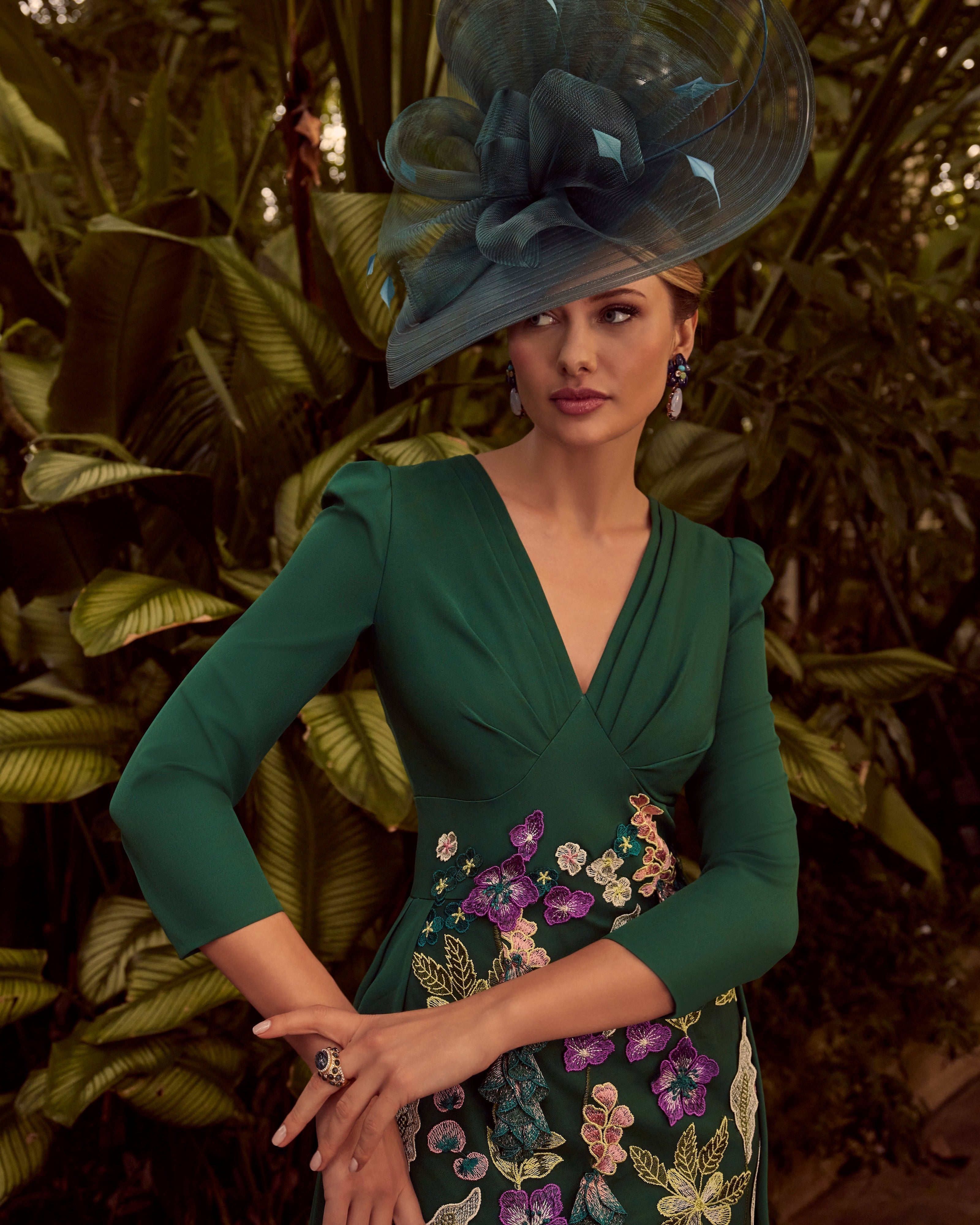Elevate your style with the Veni Infantino 992347 Emerald dress. This sought-after look features a v-neckline and sleeves, complemented by a stunning overskirt. Experience luxury and sophistication in this exclusive piece.