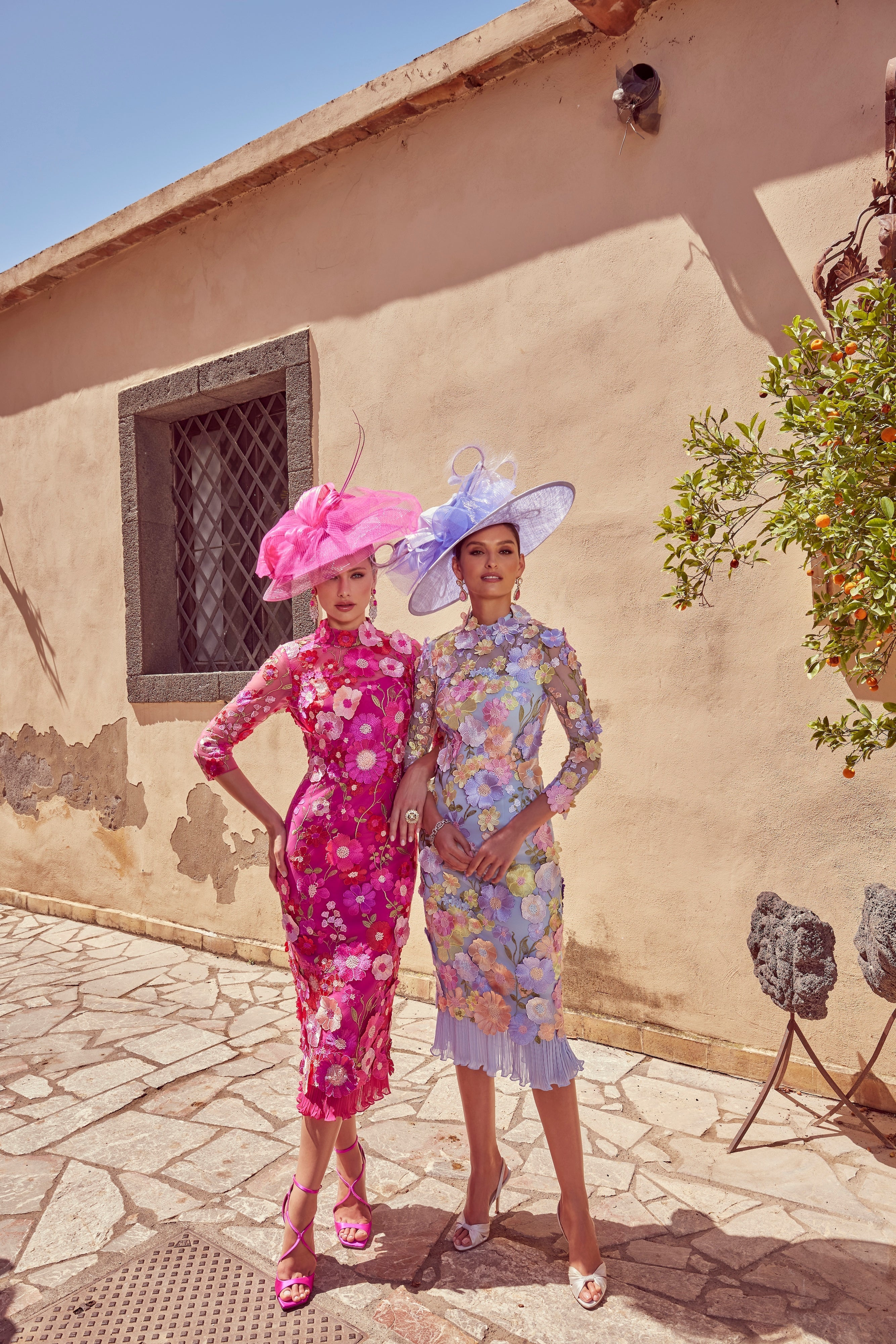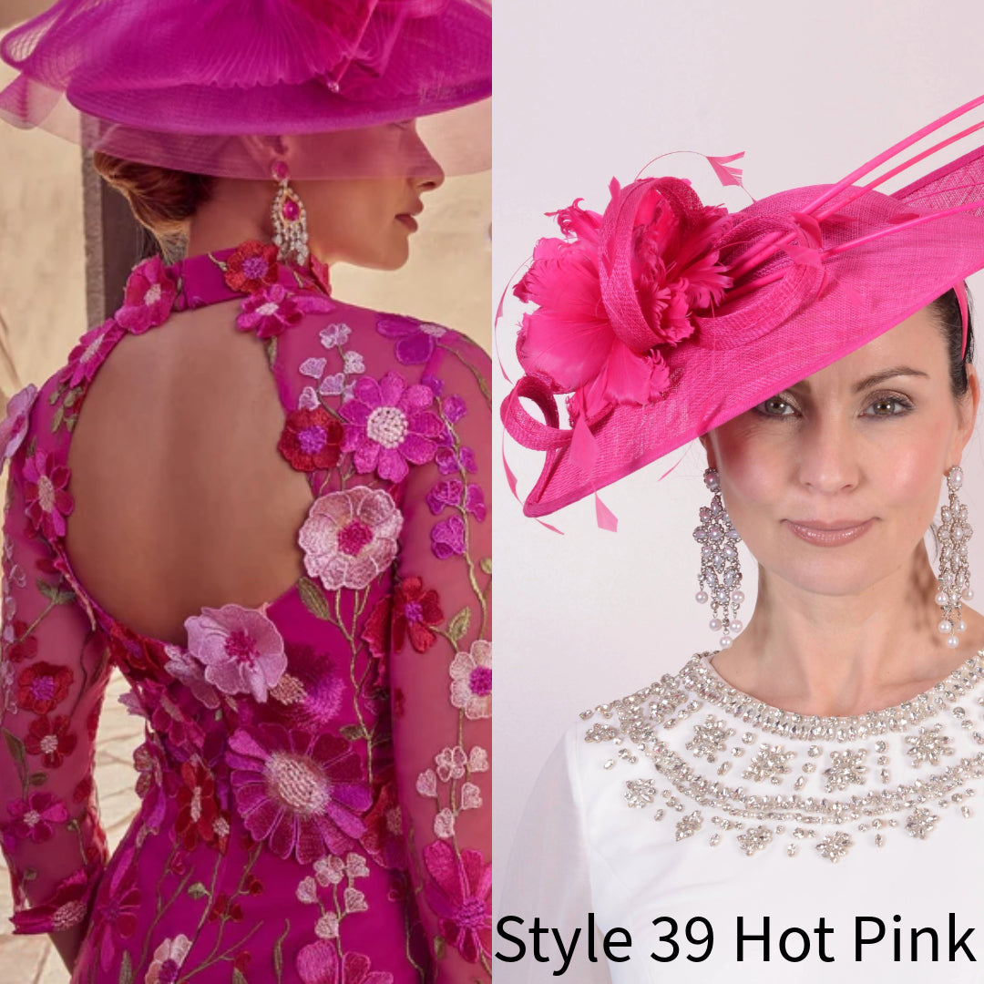 Veni Infantino 992445 Magenta fitted midi dress uses 3D floral appliqués for maximum impact. The dress has a modern cut out back with a pleated hemline. The perfect occasion dress.
