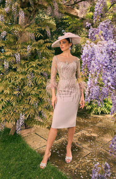 This Veni Infantino 992707 Almond dress features a sophisticated knee-length silhouette crafted from crepe, enhanced with delicate beaded tulle and feather accents on the cuffs. Its fitted design and 3/4 length sleeves offer an elegant and refined look, perfect for a mother of the bride or groom attending a black-tie event. The combination of textures adds subtle luxury while maintaining classic style.