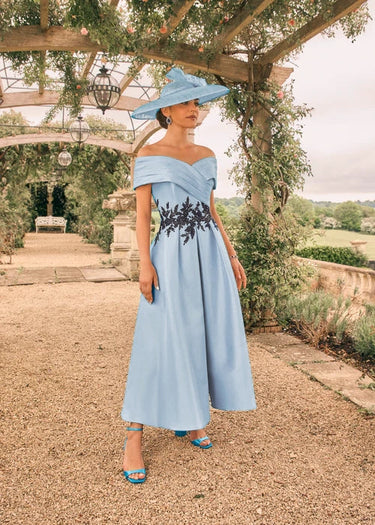 This elegant Veni Infantino 992709B gown features a light blue crepe fabric beautifully complemented by delicate navy lace appliqué. Designed with a long A-line silhouette and an off-shoulder neckline, it offers a flattering and graceful fit, perfect for the mother of the bride or groom seeking a sophisticated and timeless look.