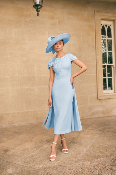 This Veni Infantino 992719B dress in pale blue features elegant cap sleeves and a distinctive caped skirt, enhanced by delicate applique detailing. Its midi length and fitted silhouette make it an ideal choice for mothers of the bride or groom seeking a refined and sophisticated look for special occasions.