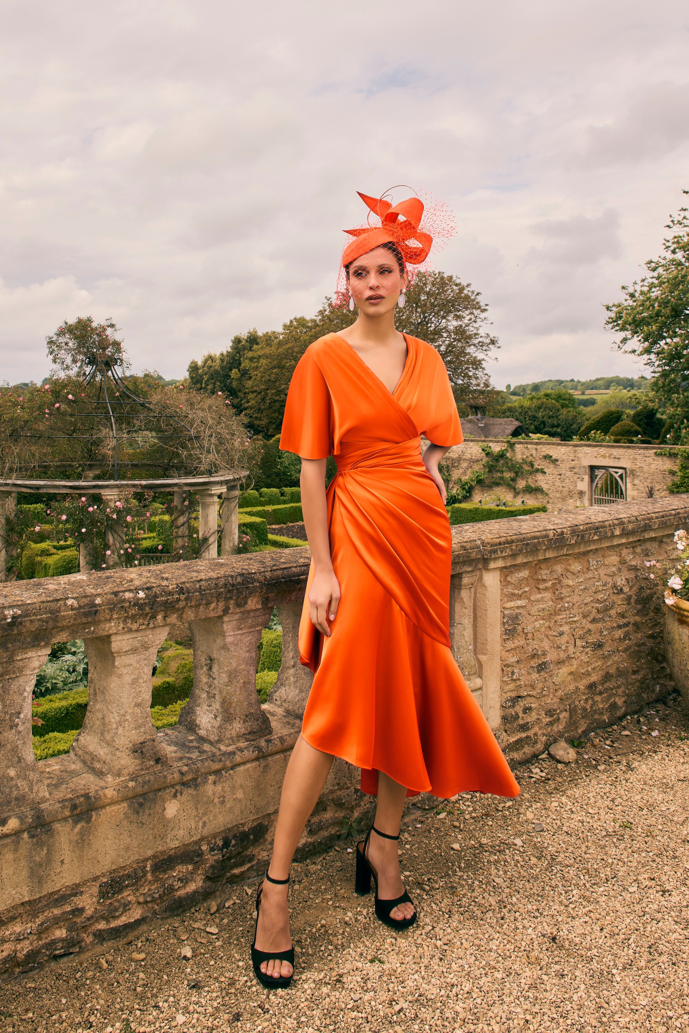 This Veni Infantino 992734 dress in vibrant orange features a flattering midi length with a wrap effect and an asymmetrical hem, creating a modern silhouette. Crafted from soft satin, it offers a smooth, luxurious feel ideal for special occasions. The short sleeves and V-neckline enhance its elegant design, making it a perfect choice for mothers of the bride or groom seeking sophisticated style and comfort.
