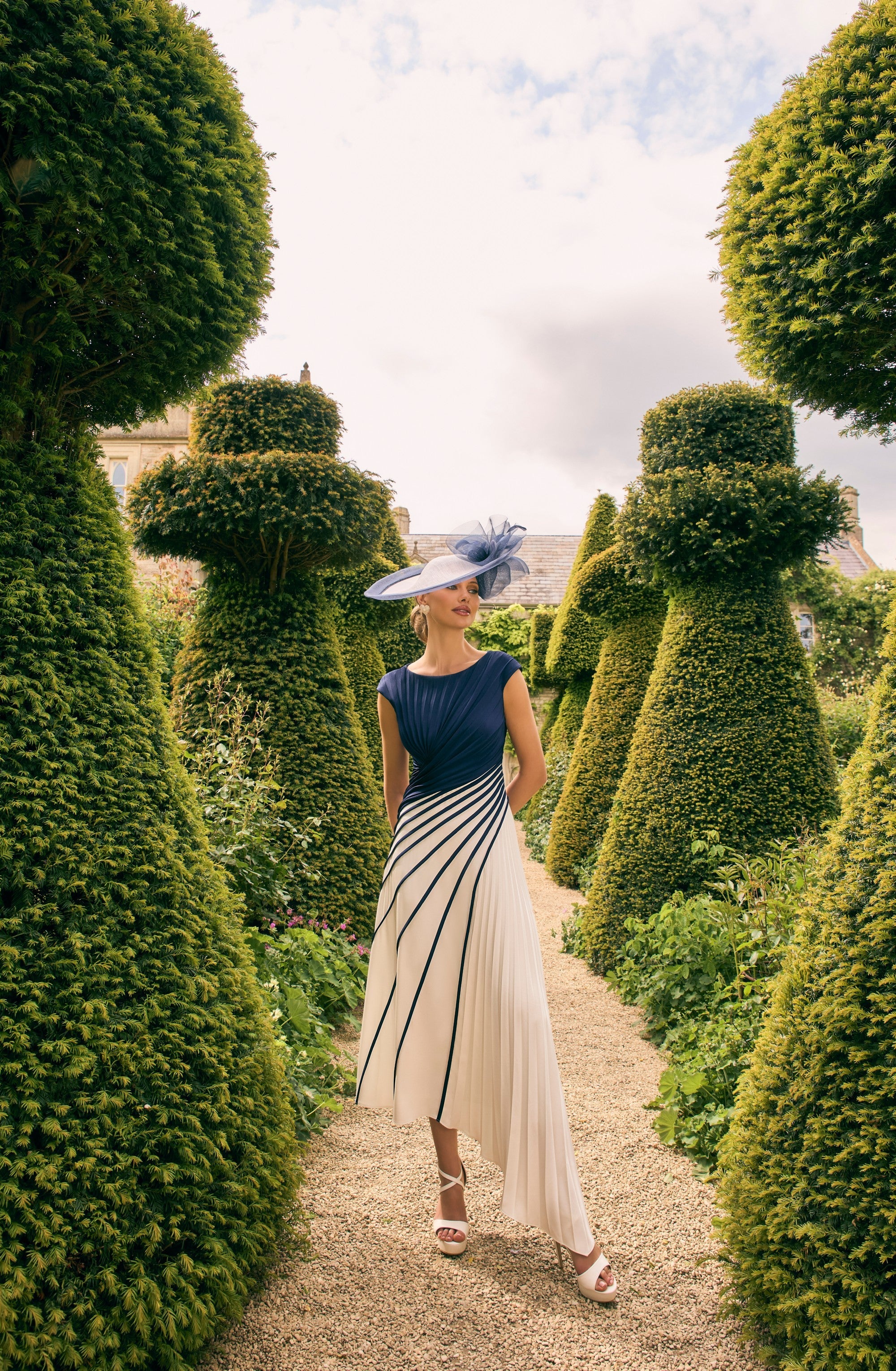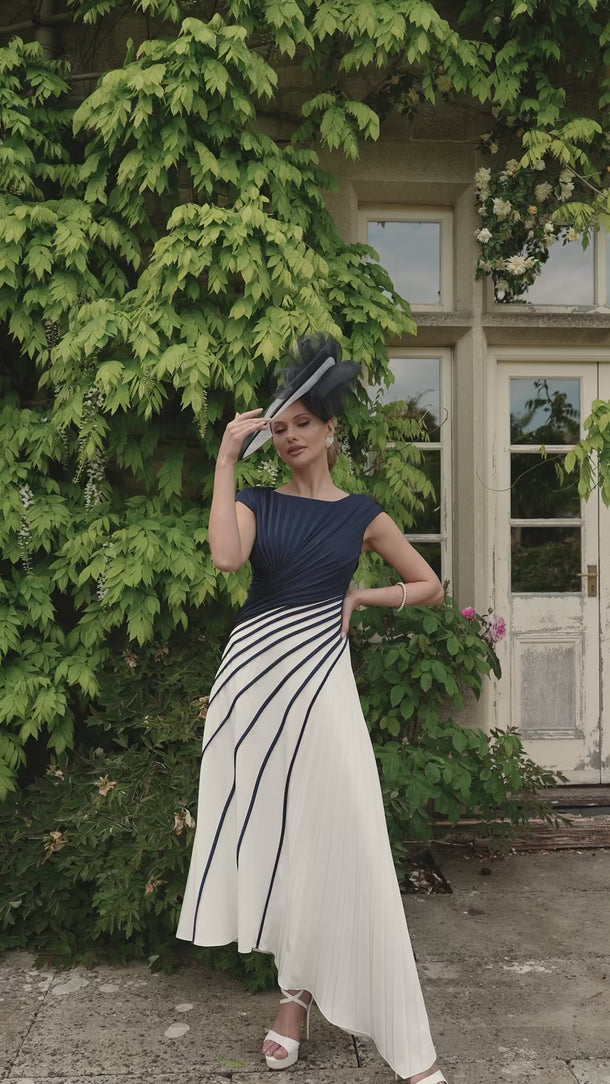 This Veni Infantino 992759 dress in navy and ivory features a sophisticated pleated crepe fabric with a sleeveless design and an asymmetric hemline. Perfectly tailored for mothers of the bride or groom, it combines elegance with modern style, ensuring a graceful silhouette for special occasions. The unique cut and refined color palette make it a standout choice for formal events.