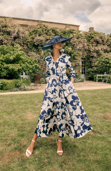 This Veni Infantino 992762AS midi shirt dress combines silver and navy mikado print with a tailored collar and elegant 3/4 sleeves. The bow at the waist accentuates the silhouette, making it an excellent choice for mothers of the bride or groom and race day occasions. Its refined design and structured fabric ensure a polished, sophisticated look for special events.