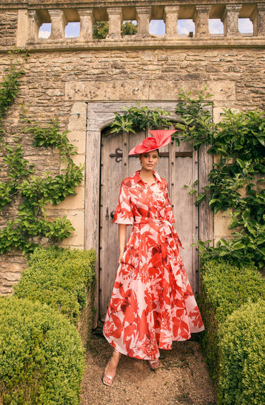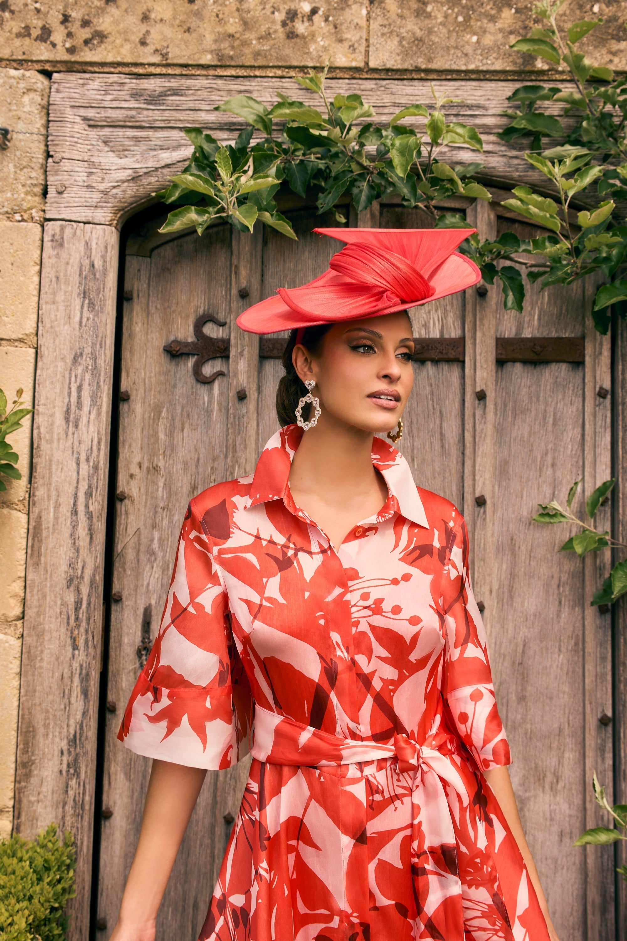 This Veni Infantino 992767 maxi shirt dress features a sophisticated orange and ivory organza print, perfect for attending weddings or race day events. Designed with short sleeves and a tie belt, it offers a flattering silhouette that balances elegance and comfort. Ideal for mothers of the bride or groom, its flowing fabric and refined pattern ensure you stand out with timeless style.